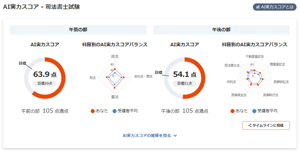 「今、試験を受けたら何点取れるのか」がスコアで見えるのは、長丁場の司法書士試験ではモチベーション維持に効きます。定期的にチェックして自分の成長を実感しましょう。