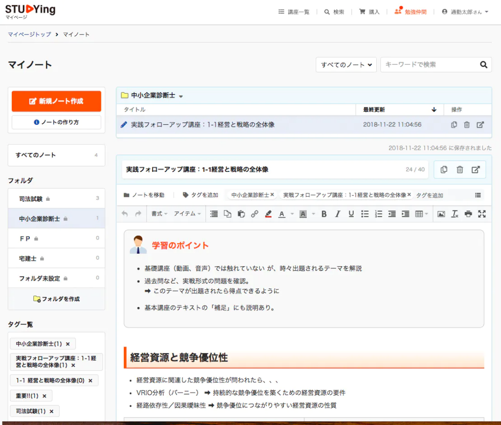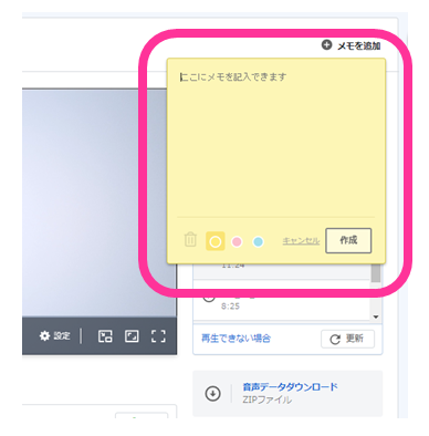 講義動画を視聴しながら、気になった箇所や後で復習したいポイントを付箋を貼り付ける感覚でメモすることができます。